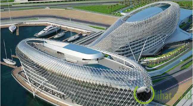 Bangunan megah ini berada di Abu Dhabi, negara yang sedang gencar-gencarnya melakukan pembangunan dalam berbagai bidang Tak cukup hanya mengunggulkan Burj Dubai yang tinggi menjulang di angkasa, ternyata Abu Dhabi punya bangunan lain yang tak kalah fenomenal, Yas Hotel. Fenomenal? lihat saja bentuknya. Saat semua lampu menyala, bentuk detail dari bangunan ini akan jelas terlihat. Mirip sesuatu ya?